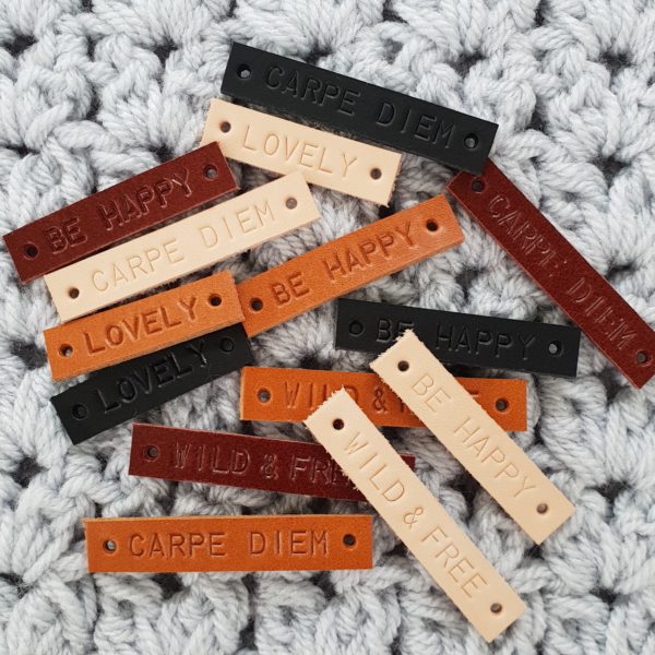Deze leren labels zijn 1 cm breed. De lengte wordt bepaald door het aantal slagletters / -tekens.