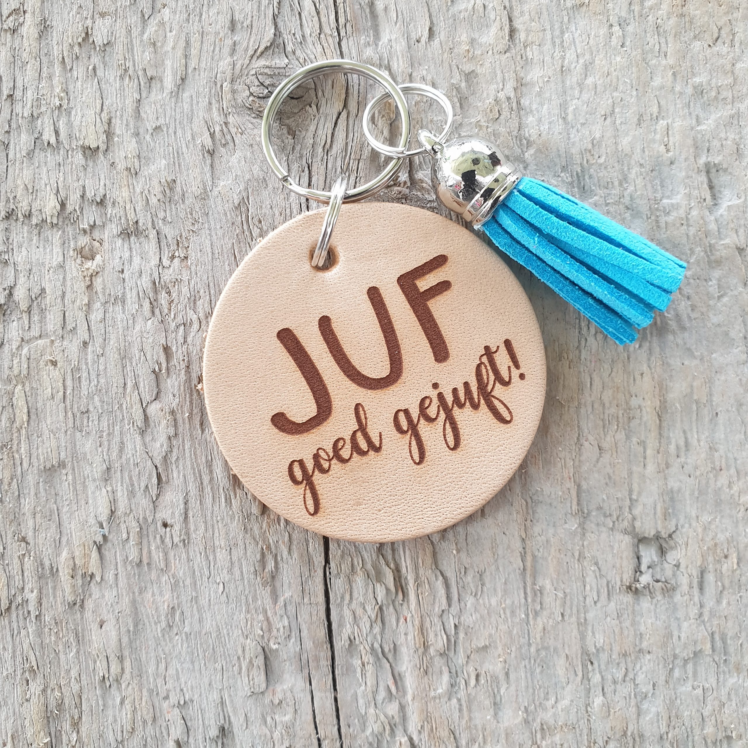 Home > Sleutelhangers > Leren sleutelhangers rond 45mm > SH-RO 22 Juf goed gejuft!